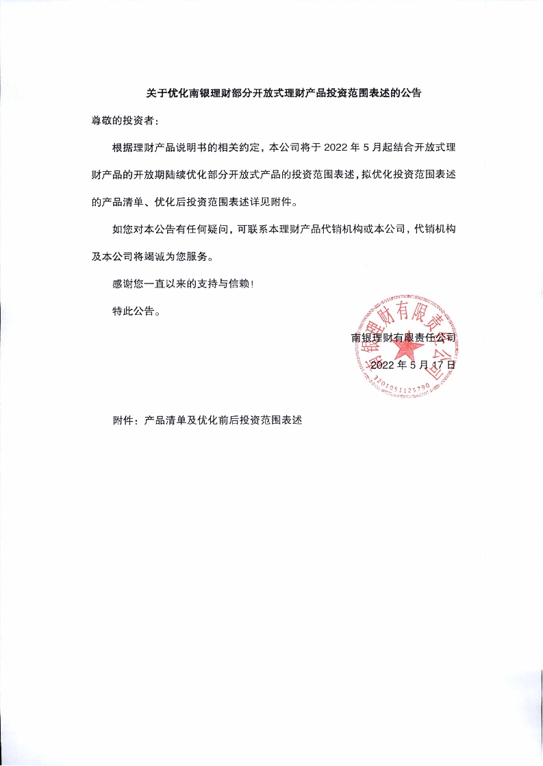 关于优化南银理财部分开放式理财产品投资范围表述的公告