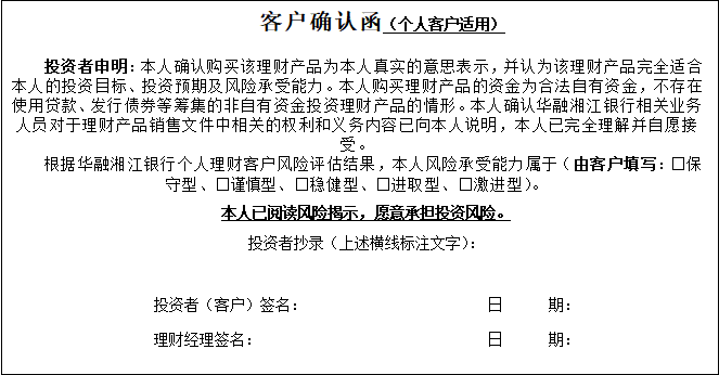 3、仔细阅读本《客户权益须知》《理财产品说明书》《风险揭示书》《华融湘江银行个人理财产品协议书》及其他销售文件(如有),确定已同意相关内容、充分了解相关风险且并无疑问和异议后,办理理财产品的认购/申购手续;