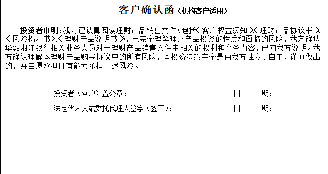 2、仔细阅读本《客户权益须知》《理财产品说明书》《风险揭示书》《华融湘江银行机构理财产品协议书》及其他销售文件(如有),确定已同意相关内容、充分了解相关风险且并无疑问和异议后,办理理财产品的认购/申购手续;