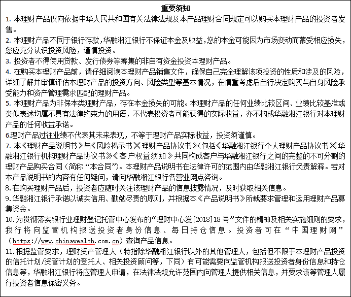 1、本产品面临的风险包括信用风险、市场风险、管理风险、流动性风险、募集失败风险、提前终止风险、抵质押物变现风险、延期支付风险、政策风险、税务风险、信息传递风险、不可抗力风险等,将可能导致投资者本金及收益蒙受部分或全部损失。由此产生的理财本金及收益损失的风险由投资者自行承担,华融湘江银行不承担任何返还理财本金及收益的保证责任。 2、产品管理人为华融湘江银行。华融湘江银行将恪守勤勉尽责的原则,合理配置资产组合,为投资者提供专业化的理财服务。但本理财产品不保障理财本金及收益,华融湘江银行发行本理财产品不代表对金融同业存款的存款银行、债券和交易方按约定履约的可能性做出任何承诺或保证。 |