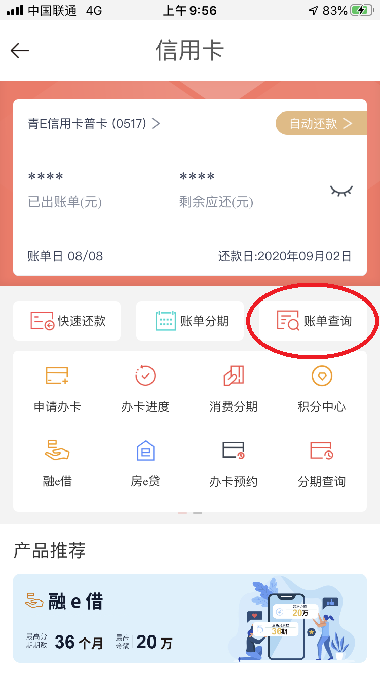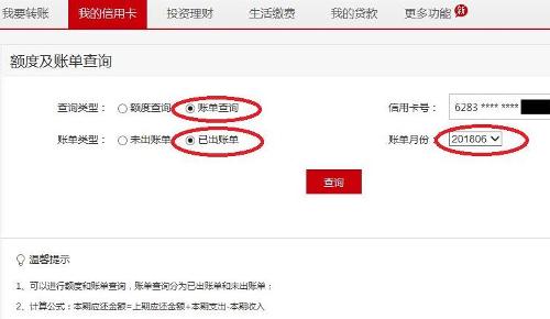 (二)进入“信用卡”界面,并选择“账单查询”,便可以查看到所有账单明细。