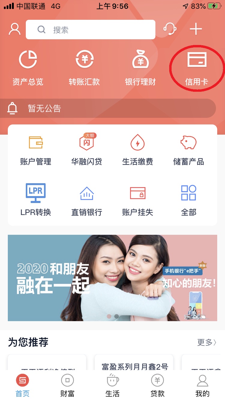 (一)登录手机银行后,点击“信用卡”。