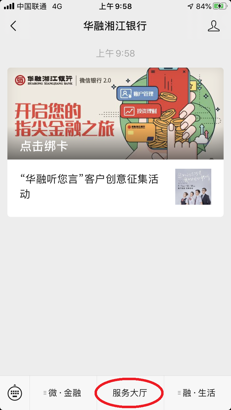 (一)进入华融湘江银行的公众号,点击“服务大厅”。
