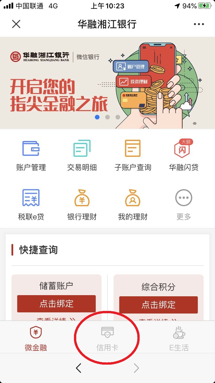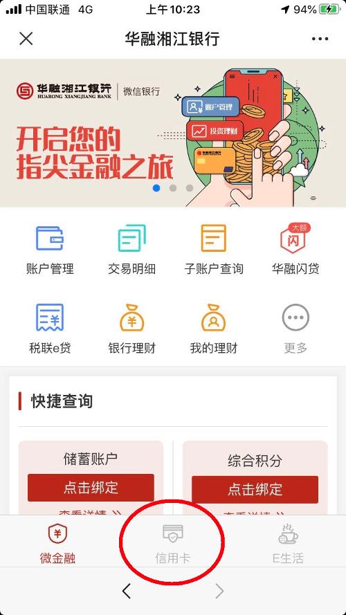 (二)在微信银行大厅界面,点击底下的“信用卡”选项,并按提示绑定微信银行。