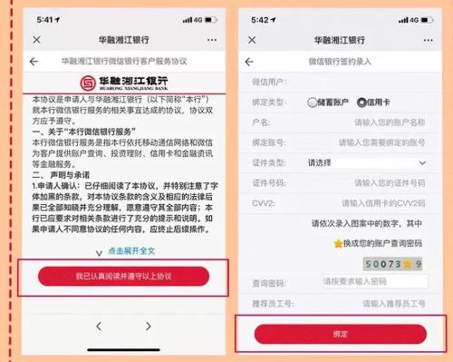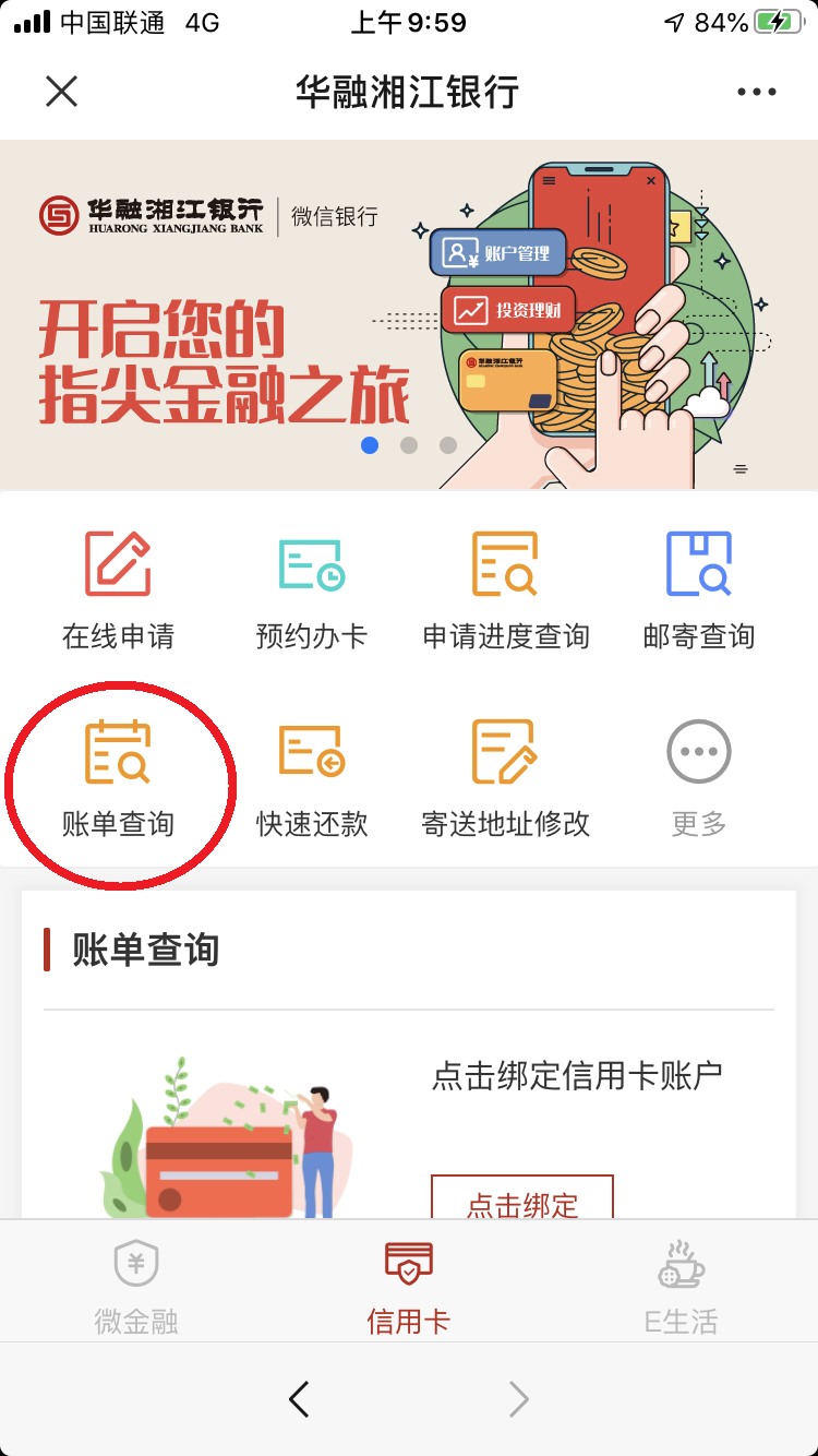 如信用卡未绑定微信银行,请信息提示和以下流程进行绑定,即可随时查询账单。