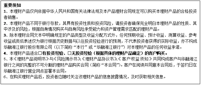 本理财产品系与银行存款性质不同的金融产品,具有一定投资风险。在本理财产品下,客户(“投资者”)委托华融湘江银行股份有限公司(以下简称“华融湘江银行”)运用理财资金进行投资,华融湘江银行保证本金安全,但并不保证理财收益。在您选择购买本理财产品前,请仔细阅读以下内容: